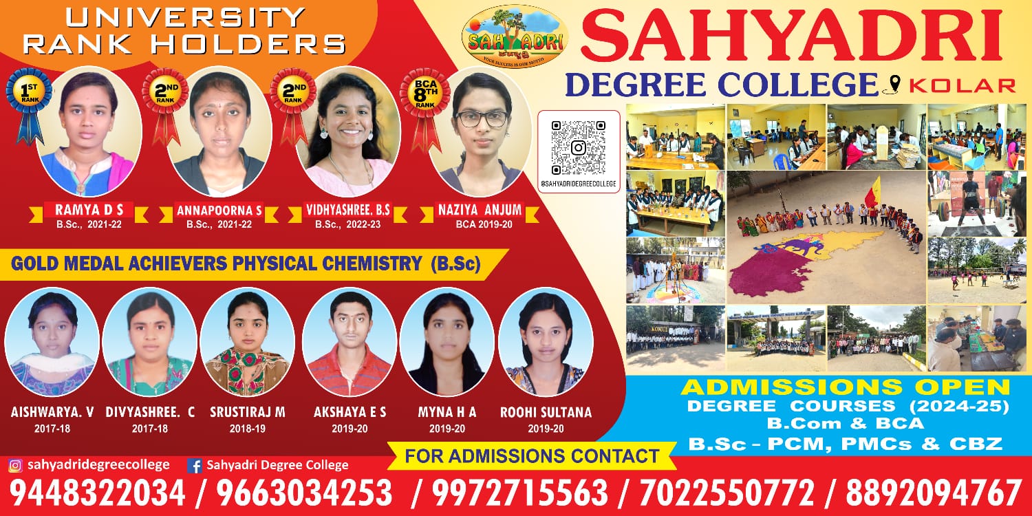 …Now the ROYAL BRAND OF SAHYADRI has stepped into Degree Courses with the same force and unlimited strength. Our institution has reckoned the importance of under-Graduate programme for the society & keeping in mind the future of our country with literates, civilized citizens. The point started with the view of imparting knowledge & making the standard of education meaningful. The ideology has ignited in the Masterminds & the founders of sahyadri such as Sri. M.UDHAY KUMAR, the Honorable President. Our institution is running Degree courses with the best results in the vicinity of Kolar. The slogan goes as “MOTIVATION IS OUR PATH, INNOVATION IS AIM & SUCCESS IS OUR PRIME OBJECTIVE”.